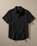 Mangas curtas com punho casual dobrável. Ombros com caimento natural sem bojo. Caimento relaxado que não marca. O tipo de camisa que funciona igualmente bem com shorts de banho em um clube de praia ou com calças de algodão em um almoço no terraço. Desenhada para o homem que se movimenta entre contextos sem trocar de roupa.